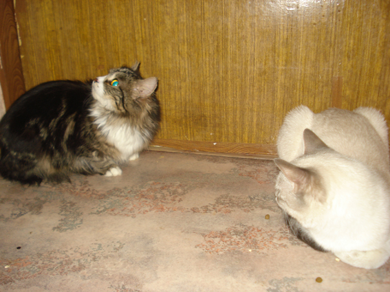 Сегодня по многоисленым заявкам Масяни, посадила ее в клетку с Чучей (конечно сама начеку была). Масяня (как дитё-подросток, сначала замахнулась, потом "затылок просто почесала", якобы испугала) Но из всего этого сделала вывод, что Чуча в последствие не будет Глав кошкой стремиться, что радует, можно будет не единственной кошкаой в семью определять.