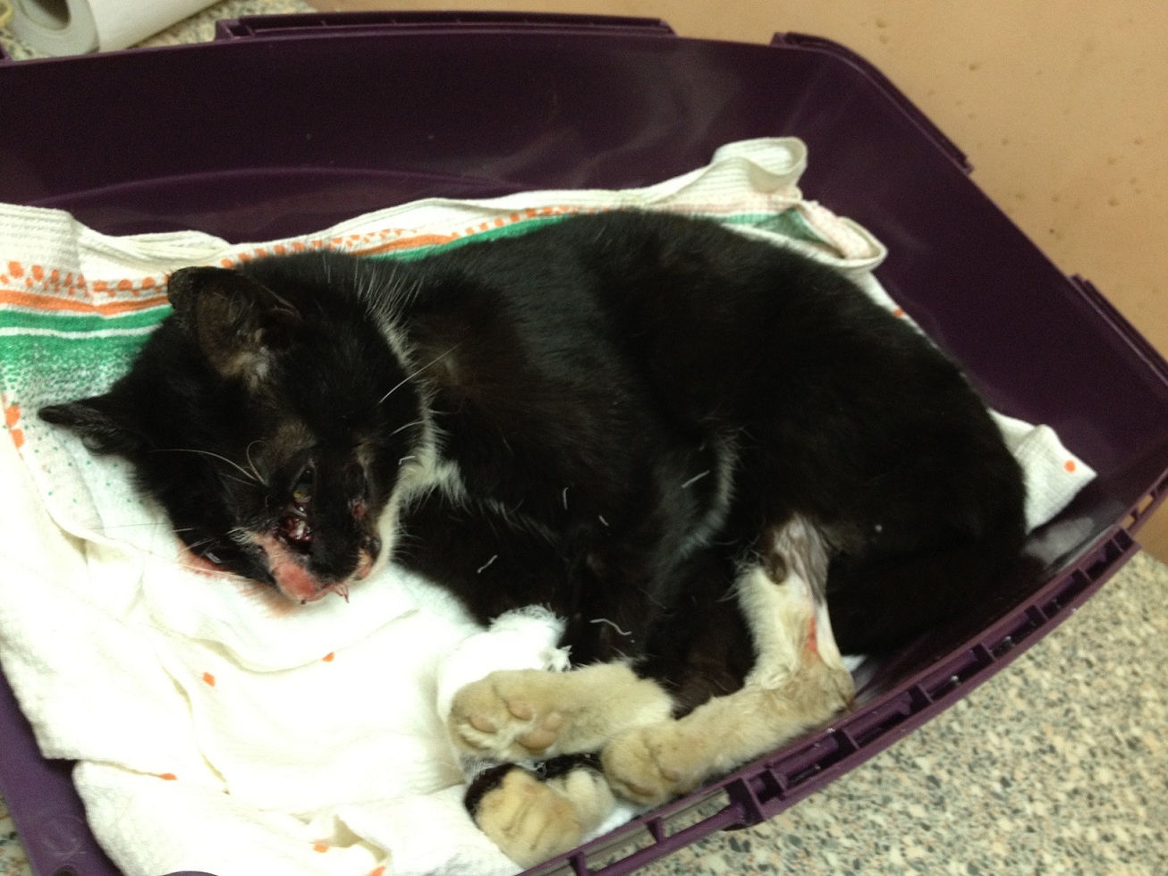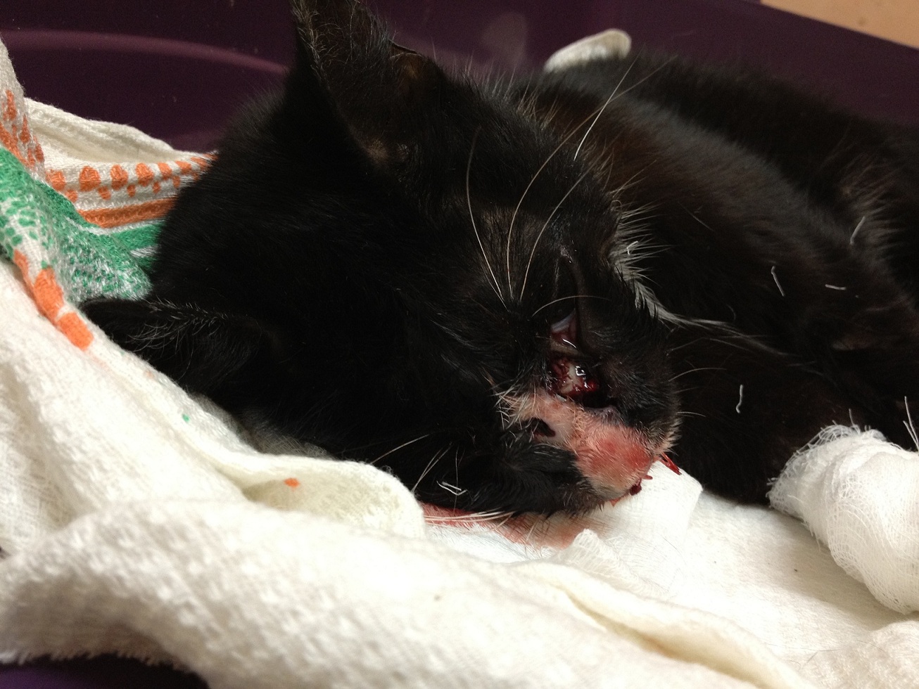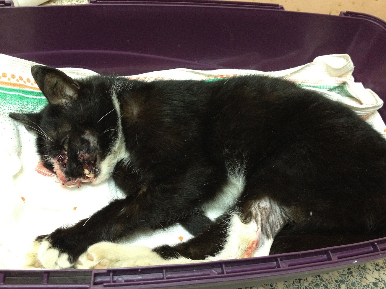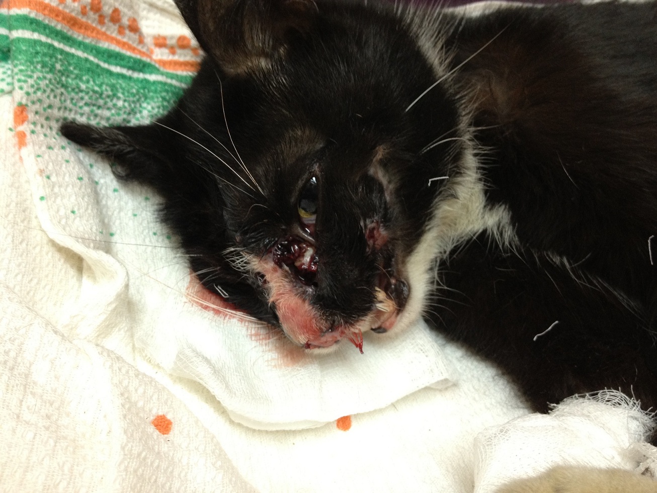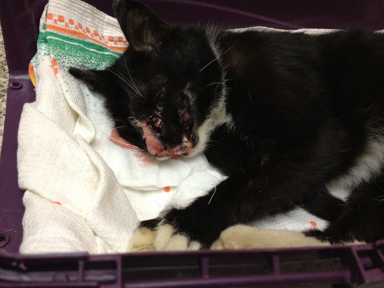 Всем привет! В общем излагаю ситуацию... Котейку оказывается зовут Васька. Малыш у меня дома. От наркоза за 7 часов практически полностью отошёл, сразу начал проситься по малой нужде на улицу, дома ну никак не хочет. Сносила его, так он как свои дела сделал, прямиком на прогулку отправился окрестности знакомые изучать) естественно, был сразу же перенесён домой. Оперцию делали час, все прочистили, носик поставили на место, немного теперь губы прикрывают зубки. Провела эксперимент-поставила неподалёку тарелку с едой, он сразу пошёл по запаху к ней, значит, как я понимаю, хоть немного, но обоняние у нас осталось или же восстановилось, хотя не думаю, что так быстро. Отек ещё очень сильный. Как сказал Мумжа(врач), он из щеки кота вынул большой коготь кошачий, поэтому остановились на версии, что всё-таки, подрали так сильно малыша коты.. Назначили нам в уколах Цефтриаксон , Капельно внутривенно Метрогил и гепарин. Пораженные участки обрабатывать промакивая хлоргексидином. Но я думаю, что Гамавит ещё нам совсем не помешает. Кот сильно истощен. Весит не более 1кг. Буду потихоньку откармливать и лечить. На контроль к врачу нам 7-8 июня, швы с губ и челюстей снимать 18-20 июня, хотя это такой длительный срок... Гнить же начнут. В общем состояние пока у нас удовлетворительное. Малявочка под моим чутким контролем.