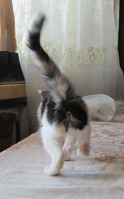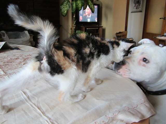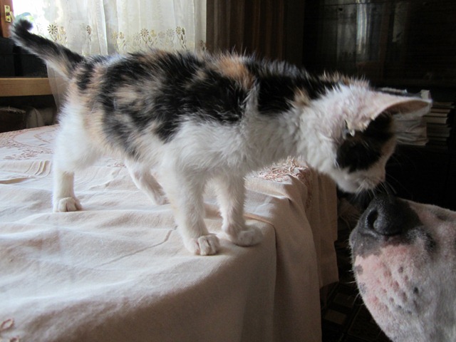 Сегодня девушка совершала променад по квартире. Изучила всё. Совершенно без комплексов! Той-терьеры были приняты за объект охоты, выслежены и загнаны в угол, откуда сочли за благо уползти по клеткам. Стаффу было дозволено вылизать живот. За излишний энтузиазм в этом вопросе стаффа выдворили. Словом поле боя осталось за кошками-Нюшками.