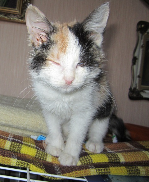 Нюшка уверенно видит правым глазом. Почти ушло третье веко. Глаз желто-зелёный. Хитрюший!!!
