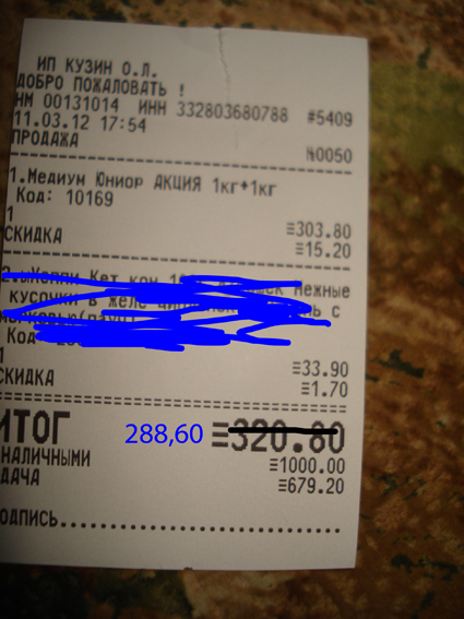 Чек, корм для щенков (Галя, я в чеке оставила только корм для щенков со скидкой).
