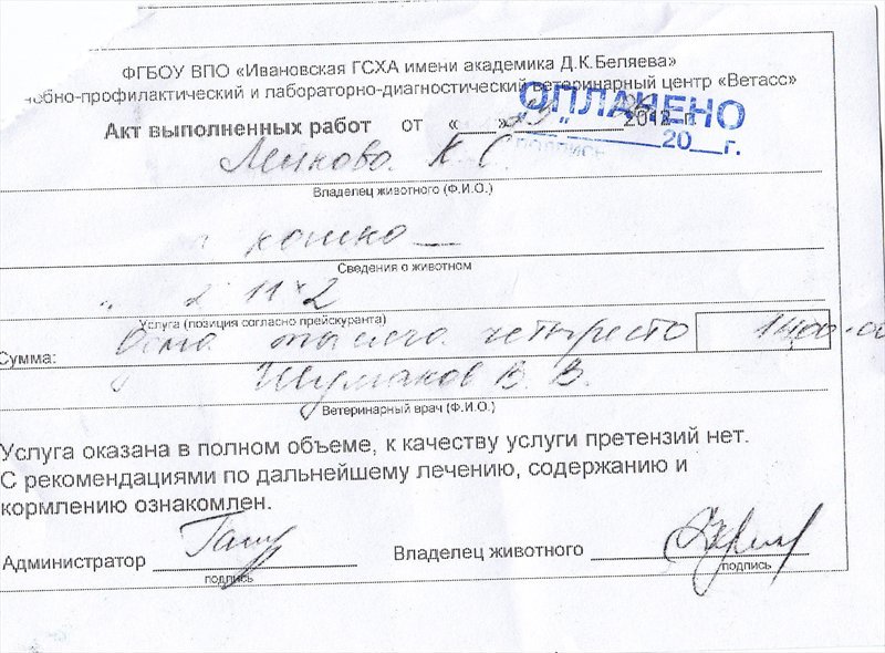 Чеки за приём и анализы крови - всего 4 133 руб. Корм - 576 руб