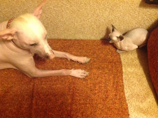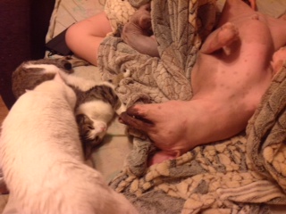 Зайкп греет собачку)))) собачка же голая мерзнет))))