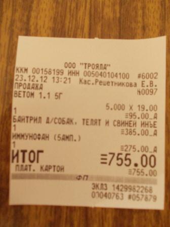 Miry писал(а):У меня еще сегодня произошло чп, котенок 5 месяцев у меня на передержке весь день рвет, поносит, не ест, не пъет, спросила в Артемиде, прописали антибиотик кобатан, фоспренил, имунофан, - от вируса. Позвонила еще Ане, она сказала пропоить энтеродезом, а завтра сделать новокаин с цефтриаксоном. Чеки по малышу включила в отчет, т.к. с деньгами сейчас туго.