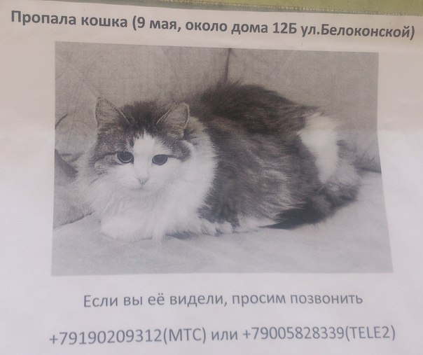 Пропала кошка. ул.Белокноской. зовут Алиса,ей 15 лет.Стерилизована,всегда гуляла во дворе дома,никуда не уходила.