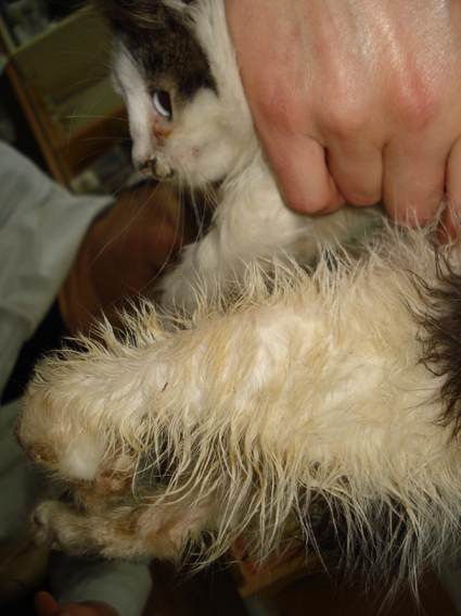 лежит в уголке весь в зеленке! пол задней лапки ампутировали уже... (одна ляшечка осталась). еще надо посмотреть как ткани дальше себя будут вести