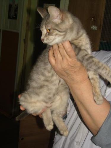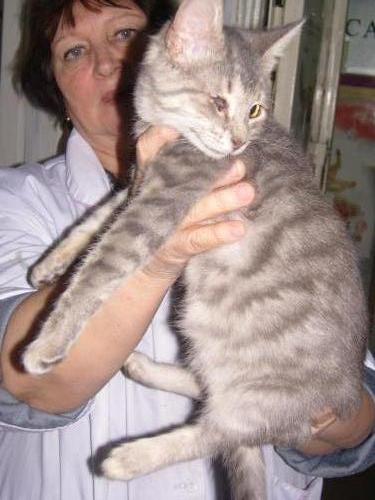 Маленькая кошечка, возраст 3-4 месяца, окрас - серый дымчатый полосатый, уже давно сидит в приюте Атлант! уже всех кто вместе с ней поступил разобрали, а она до сих пор там сидит. и не берут потому что у девочки травма глазика((( работники приюты попытались спасти глазик. в итоге он остался как бы немножко прикрытым. Котенок очень ласковый, скромный, игривый, мурчащий! но вот никак не найдет себе хозяев! сидит и сидит в маленькой клетке. кошки такого окраса когда вырастяют становятся похожими на тигров, только серого окраса. очень красивые!!!!!!!!