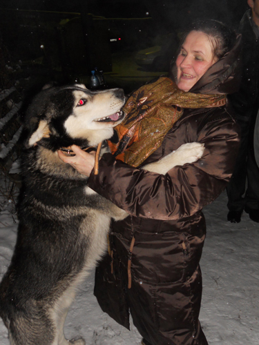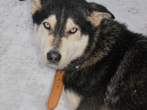 "Вот фото: кличка Тунгус (кобель), крупный метис Хаски, дружелюбный, любопытный, очень подвижный и сильный, по натуре охотник (любит брать след, все время что то ищет, поймал этой зимой зайца на 23 кг. сам весит около 30 кг, возраст около 2 лет, осенью возили в ветеринарку, сказали что собака здорова, дали пилюли от глистов и лосьон от блох.