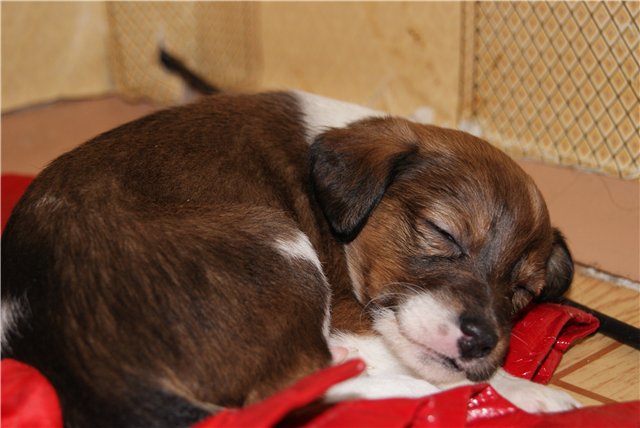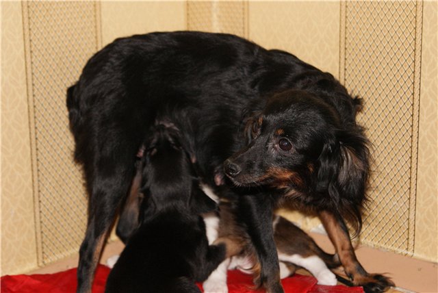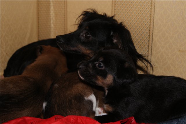 Либо я очень ошибаюсь, либо мама щенков длинношерстный русский той (русский той терьер). Фото бы побольше. Какие у нее размеры в холке и вес? Хвост купирован. На пузе клейма случаем нет?