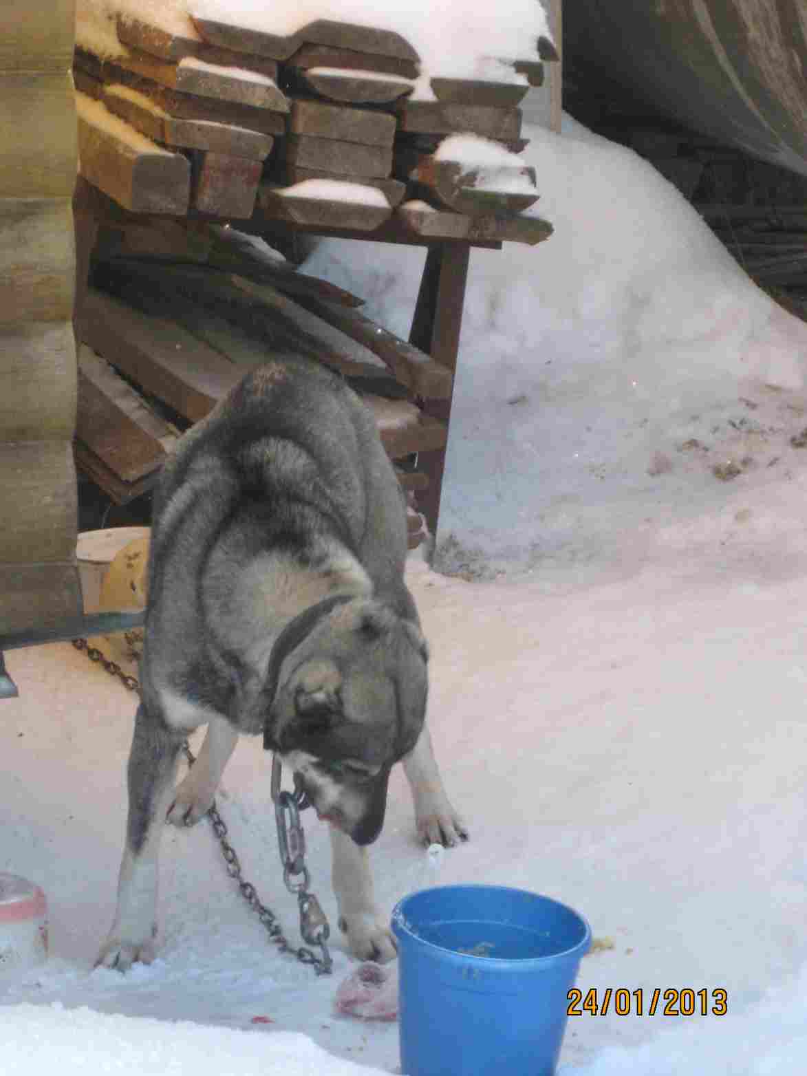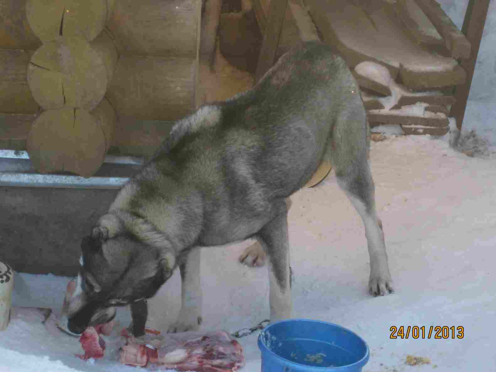 Пес постоянно голодает. Женщина его кормит как может, но ей уже за 70 лет. Зачастую когда выпадает много снега она не может пройти к дому соседа, и собака сидит голодная.