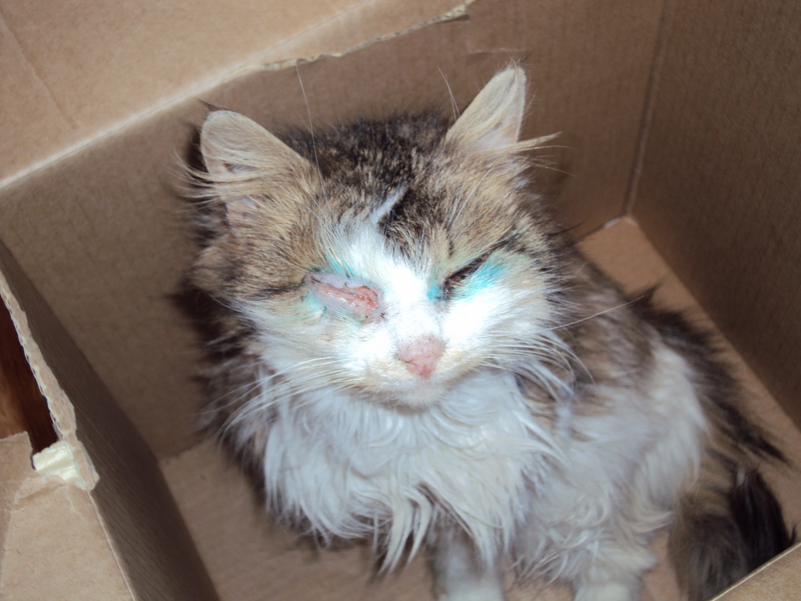 SOS!Жертва людского садизма! Помогите пожалуйста! Кошка приехала во Владимир за лечением и дальнейшем пристройством. В подъезде г.Камешково, какие-то уроды взяли в выжгли глаз сигаретой кошке и сильно избили кота (кот более-менее оклемался и остался жить на прежнем на месте). Кошечке повезло меньше. Она вся дрожит, от страха и боли, молча всё терпит, лишь трётся и урчит, просясь пожалеться-и боясь((( Видно,КАК же ей досталось ((( Миниатюрная красавенная трёхцветка с рысиными бакенбардами, львиным опушением на грудке-НО слёзы(((