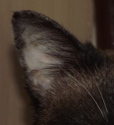 В глубине ушей вроде все чисто, незначительные желтенькие выделения. Но вот кончики ушей внутри в черных точках, и по краю как-будто шерсть подерганная. Ухо она правое чешет, и глазик с этой стороны слезится начал. Я ей вчера глазик обработала тетрациклиновой мазью, а уши - протерла перекисью. На ватке ничего не было. Но сегодня и ухо она не чешет, и глазик лучше. Вот фото ушка.