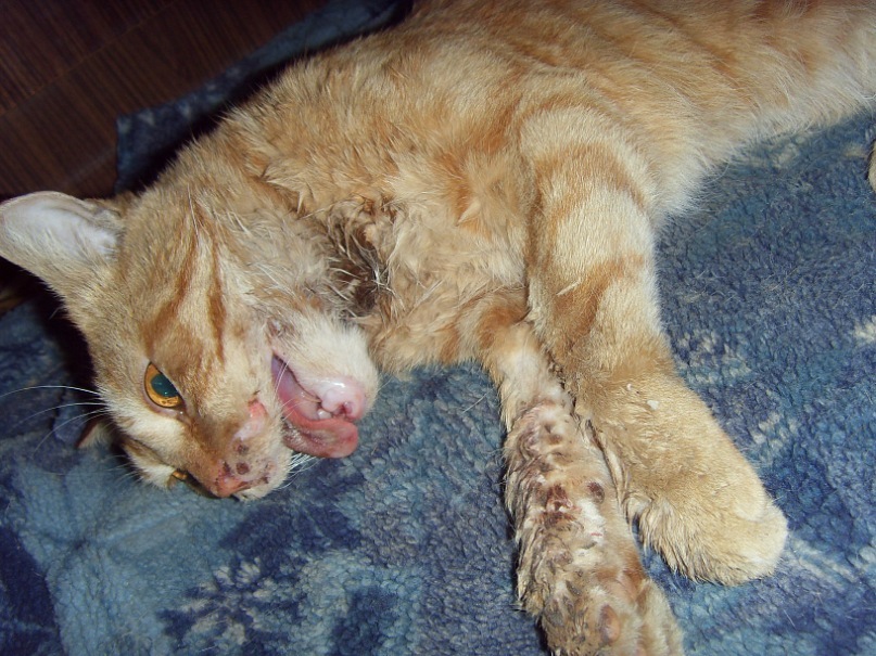 очень его жалко, кот очень добрый,вышел на "кис-кис", жмурился(улыбался) когда гладили.смирно себя вел во время уколов.но очень кричал когда стали обрабатывать рот,от боли.потом долго рычал и сопел, видно, очень больно.очень красивый котяра, возможно домашний