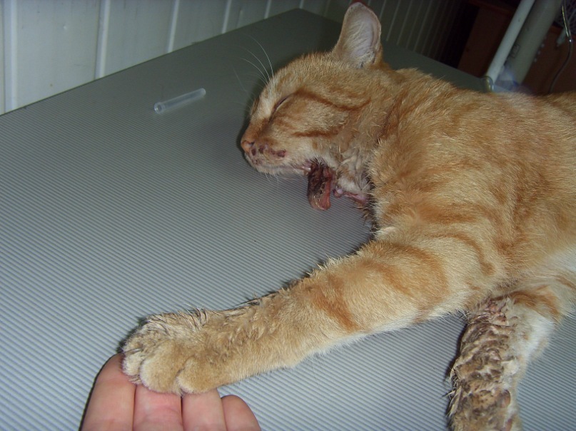 сейчас кот на обезболивающих уколах заснул. судя по всему, кот не спал несколько дней, т.к. он не может положить голову - больно.