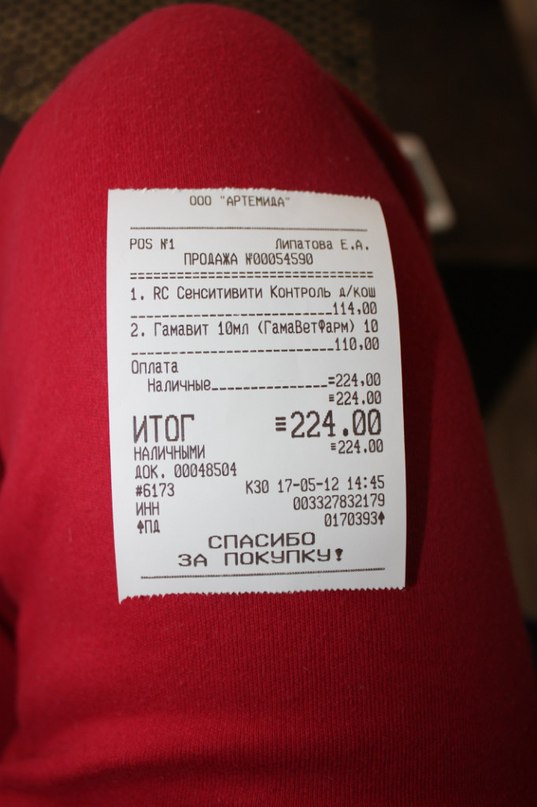 И сегодня еще купили гамавит и спец.корм на 224 руб. тоже чек прикладываю!!! Вечером еще поедет за амаксицилином!