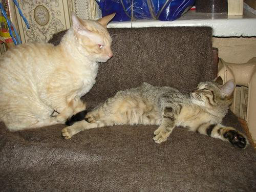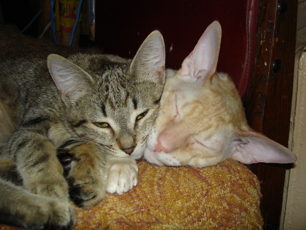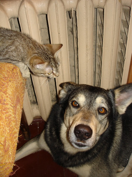 Уррра!Значит все же фото пришли!!!Сейчас попробую еще послать-там как Жужец с Серым знакомится.Я больше всего за их встречу боялась,но Жужа оказалась такой то ли слабенькой,то ли напуганой,то ли уставшей,что на собаку никак не среагировала.Ну а он умняк,он и Клюкву(белую) воспитал и Ластика(корниша).Если бы она зашипела,он бы разволновался и стал бы проявлять больший интерес.А так он ее понюхал,облизал и отошёл.Правда первые три дня жутко ревновал-ведь все внимание было Жужелице.И вкусняшки все ей.Но я всем старалась поровну-и нямки и внимание и почесушки.