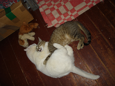 Вот так они с Клюквой играют-Жужа на нее нападает.Она вообще на всех нападает,только об Серого трется)))И ,кстати,отказалась от натуралки,это огорчает-мягкие пакетики ей подавай!