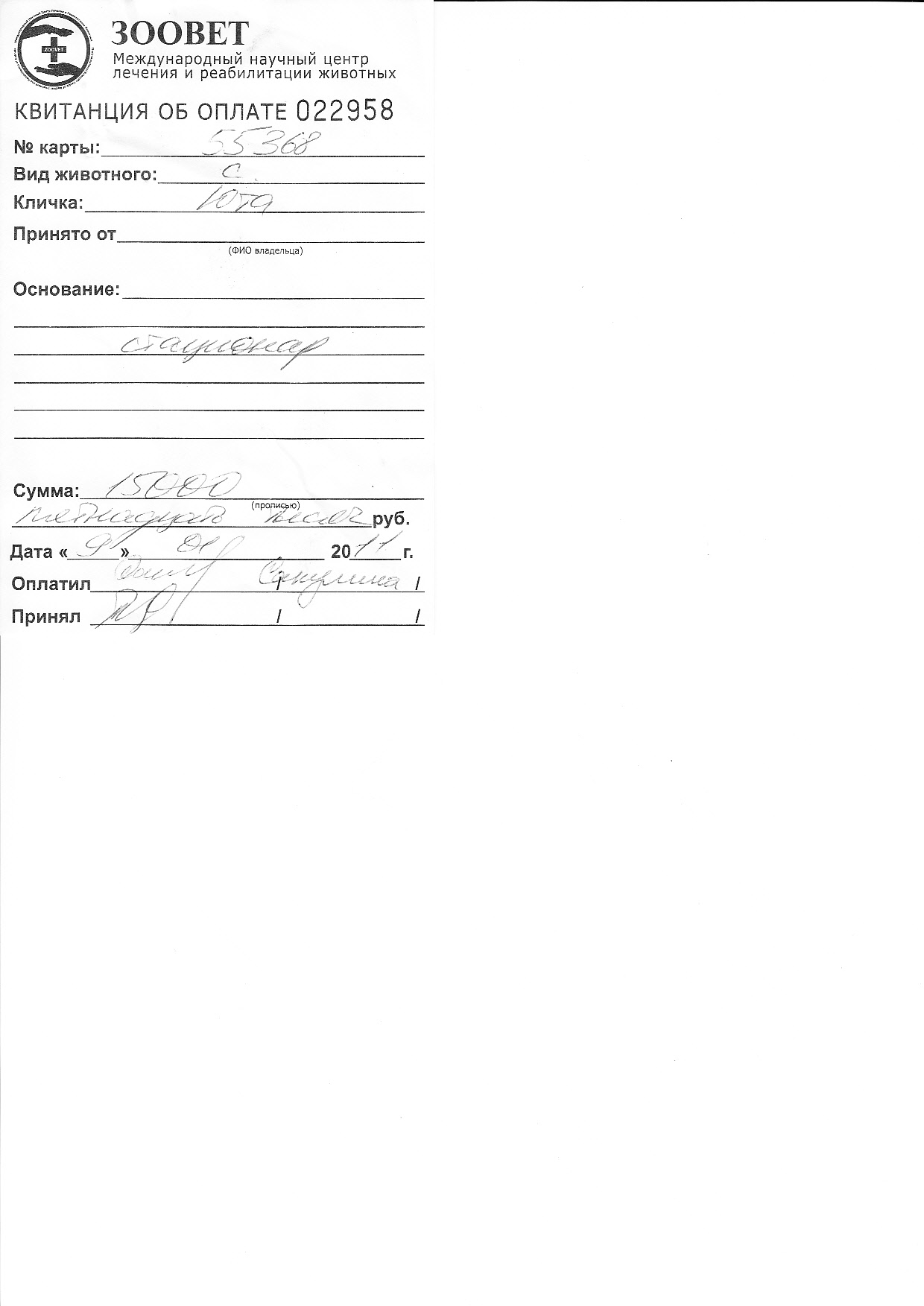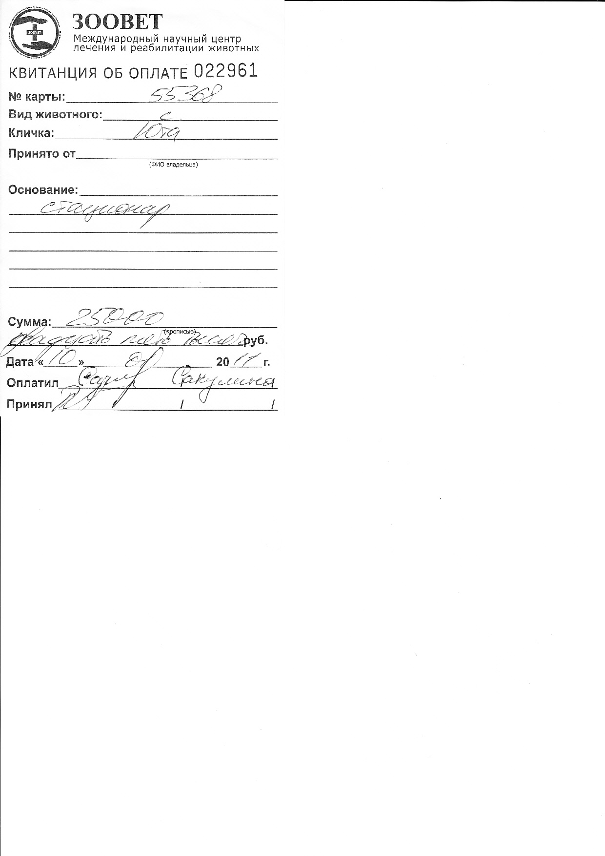 Передала вечером 2500 руб. Г.Ю. от себя и Nimfodora для эрделя Юты. Взяла у Г.Ю. квитанции о предоплате в "Зоовет". Они без печати, окончательный счет будет при выписке животного. Есть также счет из ООО "Шанс Био" (г. Москва) с печатью за проведенный анализ. Сейчас налажу сканер и постараюсь разместить эти документы здесь. Свежей информации по Юте пока нет, сегодня ее другой человек навещал.