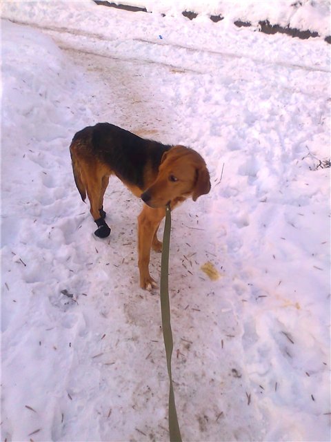 На прогулке Марина лапки или бинтует или ботиночки одевает специальные.