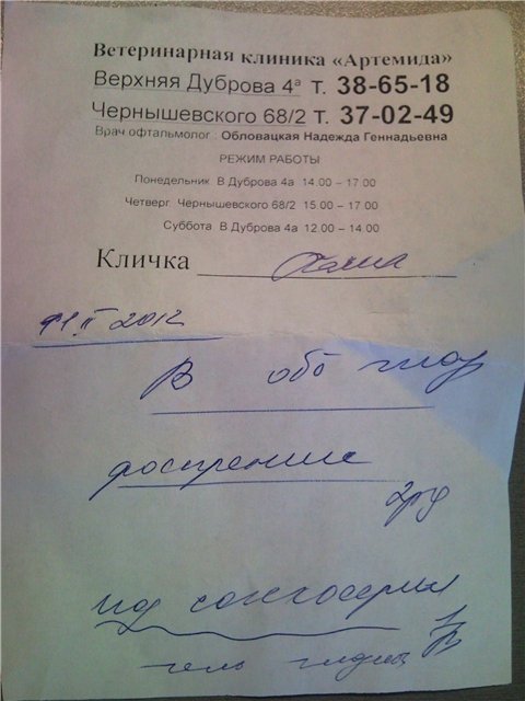 Вчера были в Иваново. Сделали снимки и оказалось, что у Паши свернута шея, вывих задней лапы (уже давольно давно), ну и киста третьего века (скорее всего после травмы)! Одним словом УЖАС!! Не перестаю удивляться врачам!((( Сейчас сделать с травмами ничего уже нельзя, он останется таким на всю жизнь(((( Кисту вчера удалили! Бедный Пашенька, пришлось все делать под местгной анестезией, а это всего лишь капельки в глаза((( По собственному опыту знаю, что такое местная анестезия!!(((( Можно сказать НИЧЕГО! Вчера чусть сама не упала в обморок, не представляю как он все это вытерпел((( Сейчас глаз отек сильно, капаем капли обезболивающие и плюс лечение, также делаем уколы, на котроль через две недели. Каждый раз когда закапываем глазик, приходиться его раскрывать, и все там промывать...это просто кошмар((( Он постояянно лежит в углу, видимо совсем больно, но груши и яблоки трескает с удовольствием (хоть это меня утешает)!