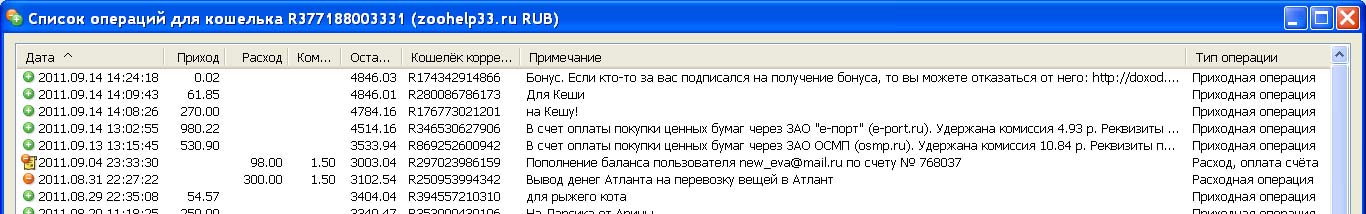 13.09.2011 11:04 450,00 Перевод от пользователя Яндекс.Денег на Кешу