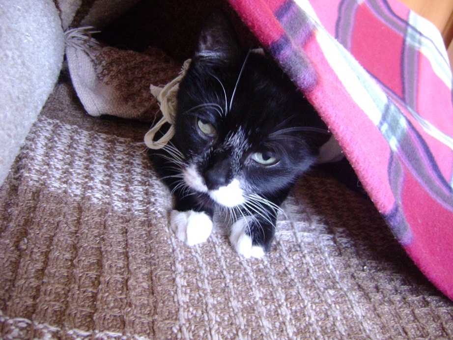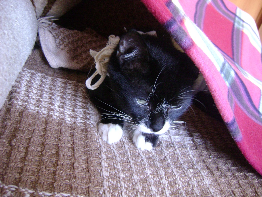 Лизе надела попону, хулиганит , пытается разлизать швы. Еще она все время пытается куда-нибудь спрятаться,то на полку в шкаф, то под одеяло. Сделала ей шалашик из одеяла.