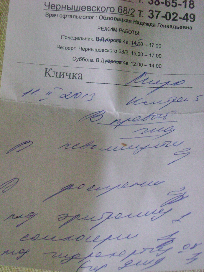 Сегодня ездили с Мирой к офтальмологу. У нас не проникающее ранение роговицы.Назначили лечение. Лекарства часть купила, часть осталась от лечения Лизы. В понедельник нам на повторный прием.