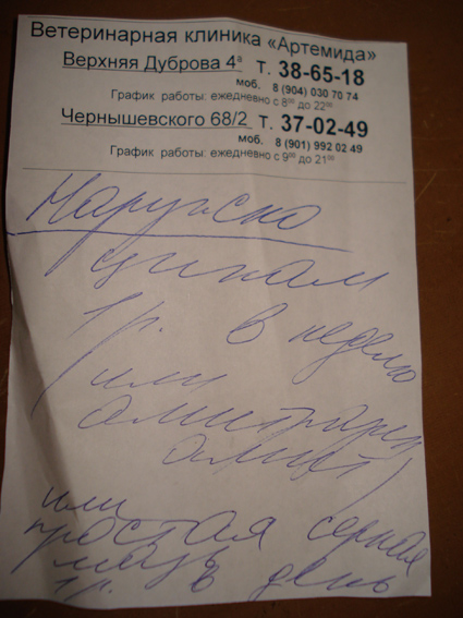 клещом. Все требуемые лекарства куплены, находятся в Атланте. Чеки и предписания врача выставит Mar33_33 завтра, при мне не было фотика.