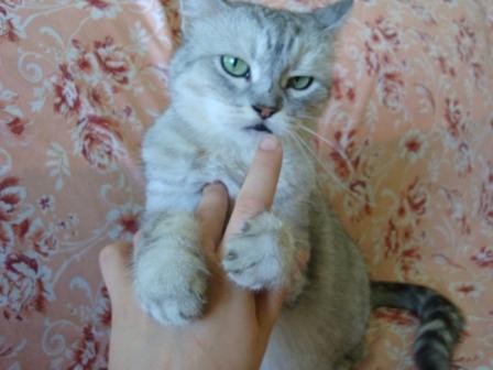 Если не нравится что-то, даёт знать сразу но намёками. Лапкой спрятав когти слегка ударит, второй этап может выпустить когти - при этом ни разу не оставила на руке моей царапины, ни разу (контроль над собой присутствует). И когда с третьего раза я не понимаю (проверяла), она сжимает мой палец в зубах так, что я и вытащить его не могу из пасти и ни больно ни чуточки. Я её говорю: ладна, ладна, я поняла. Отпускает. Тоесть нападения с её стороны никогда не было ни на Сарку, ни на нас. Очень адекватная, в плане психики устойчива, не труслива и не паникёрша, уверенная в себе кошенция.