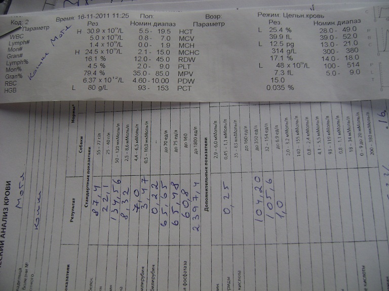 Черная Мотя - почки, печень, очень низкий гемоглобин, проблема с поджелудочной. Через 10 дней повторный осмотр.