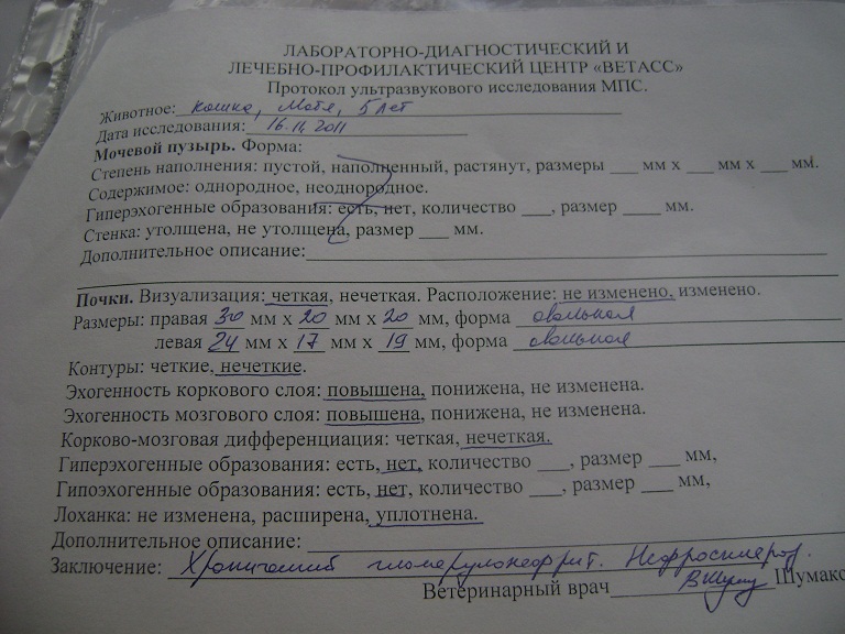 ПоМарте сделали анализы крови на общий и биохимию,УЗИ обеих почек ,печени ,мочевого пузыря,желчного пузыря, селезенки.Анализ кала на простейшие сделать не удалось,мало материала. Отвезем его ,когда поедем с Мотей на повторные анализы через 10 дней. Диагноз гепотоз,холангит,хронический холецистит,хронический пиелонифрит.