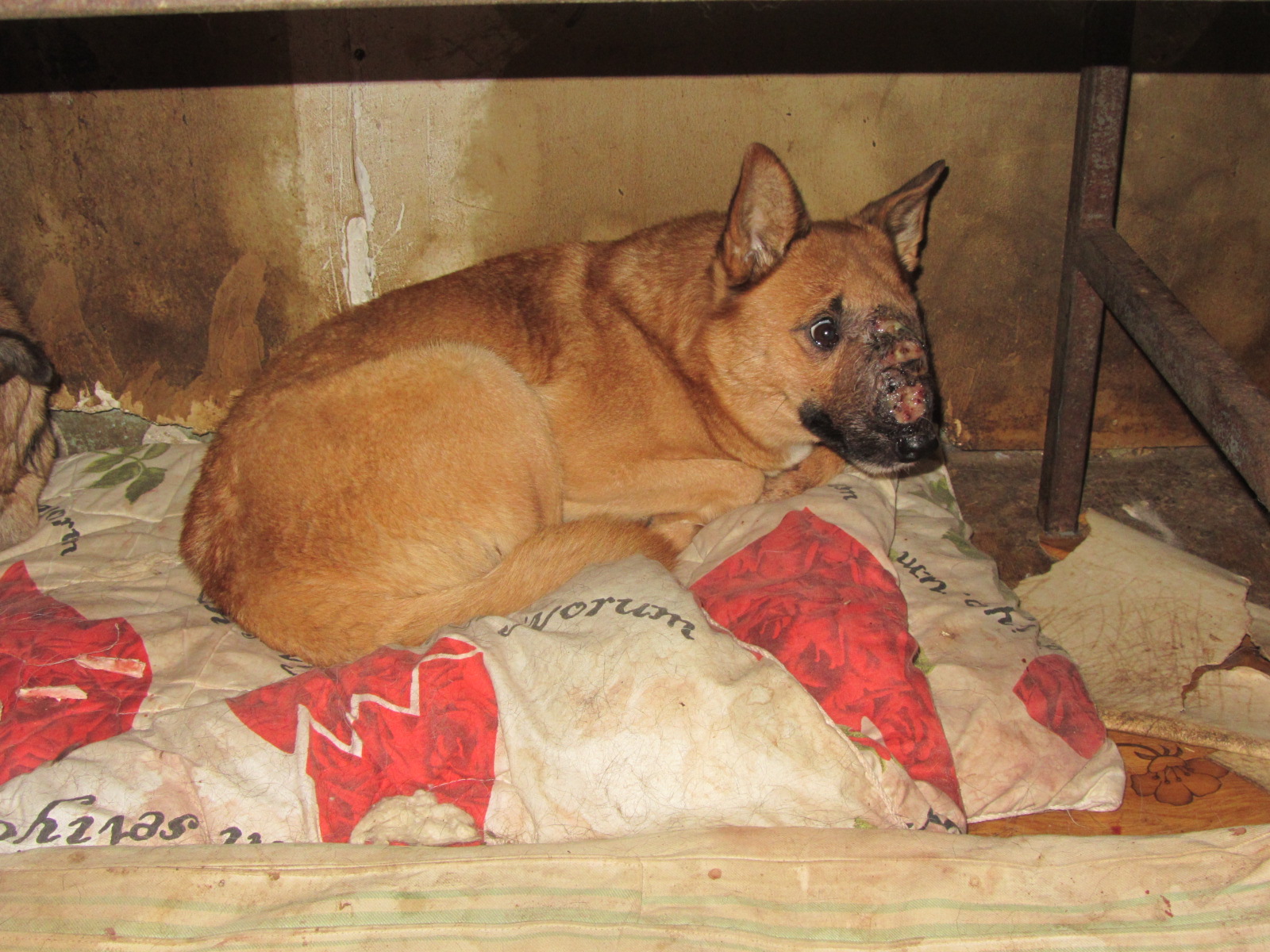 Прошлым летом с ней приключилась беда - в простой собачей перепалке за кость ( и дракой-то назвать нельзя, так, поцапались немножко)))) ) беднягу укусили за нос. Попала инфекция, началось воспаление. Дальше-больше... Разнесло всю морду. И вот тут сказались и месяцы скитаний, и голодуха, и пережитый холод. Иммунитет никак не может перебороть болезнь. Да она живёт. Она терпелива. Она ест через силу и даже пытается вилять хвостом. Но гной сочится из носа и по глазам, а морда вся покрыта незаживающими язвами.