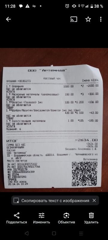 1218 руб. повторный прием в клинике Артемида, иньъекции (17. 04. 2024)