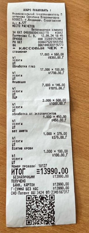 13990 руб. - чек от 12.09.24 (прием, обработка, анализы, стационар клиника Симба)