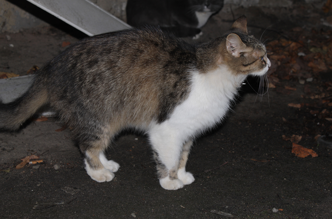 зато нашли другую компанию, думаю кот и кошка в нашем подвале. Белый скорее всего кот (честно даже забыла посмотреть), с виду скорее всего старый, а может побитый жизнью, ушки обморожены, вроде и толстый, но хребет прощупывается, ручной!! Кошечка, подойти хочет, но побаивается...