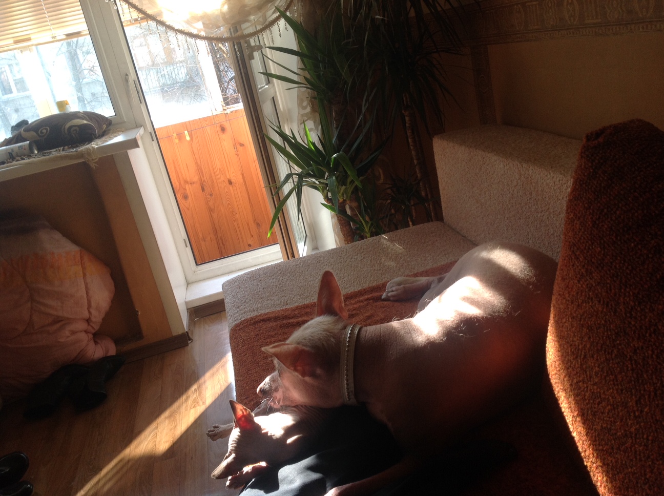 Зайкп греет собачку)))) собачка же голая мерзнет))))