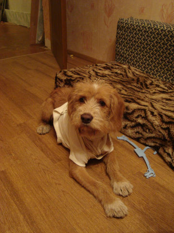 "27.02 в центре, около дома Офицеров, был найден небольшой пёс персикового цвета с купированным хвостом.После того, как дома накормили и отмыли,на теле обнаружили три глубокие ,гниющие раны от укусов.1 марта возили к ветеринару.Сказал,что возраст пса примерно 6 месяцев.Естественно требуется лечение,промывание ран перекисью,далее мазь левомиколь,уколы антибиотиков.Через 10 дней нужен укол от бешенства.Пес добрый,в туалет ходит на улицу.Ищем старых,новых хозяев.У себя оставить не могу,не прокормлю! (уже есть пёс и 2 кошки)"