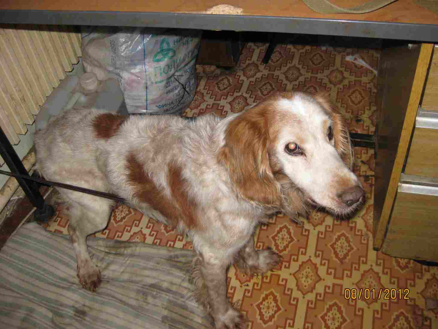 И очень симпатичный рыже-пегий русский спаниэль. Кобель. Старенький. Несчастный. Курлычет как гусёнок. Может, кто захочет приютить????