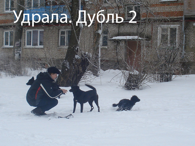 Паркуемся прямо носом в сугроб. Выскакиваем. Прямо у машины две собы - обиженные и униженные. Спаниэль прижавшись к борту машины, делает лужу со страха. Дождались малыши спасителей! Правда, присмотревшись, выясняется, что спаниэль это не совсем спаниэль, и уж тем более не английский коккер, а скорее метис, очень чистенький и в ошейнике. Поднимаем глаза на пуделя, и в этом момент выясняем, что спаниэль-метис дематериализовался. Совсем. Без следов. Ну ладно... Пудель перед нами. Клянчит, бедняжка, сухую корочку у бомжа. Сам мокрый и грязный. А бомж, оглядывается на нас, и бормочет, что это обед его (пуделька то есть) мы спугнули. (в Собинке-то по слухам едят собак) Словом, животину надо спасать! Хватаю поводок и печеночный паштет. Марина выдвигается вперед... Пуделек посмотрел на нас отсутствующим взглядом и шасть мимо во двор с расторопностью необыкновенной. Мы прыгнули в машину и вперед, за ускользающим хвостом внутрь двора. Тут я поняла, что такое дворовые проезды в Собинке! Это вам не Берлин, не Москва и, даже, не Владимир. Почти трасса ралли. Возблагодарив бога, что у нас кроссовер преследуем хвост. Хвост нашел себе пару друзей и веселится во дворе. Выскакиваем борзо (заметьте, даже ключи не забрав из машины...) и не спеша подходим к троице. Как бы мы мимо проходили, и не нужны нам ваши пуделя. В руке паштет и поводок. Троица замирает. Почти-овчар в ошейнике шустро улепётывает в ближайший подъезд, парочка