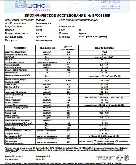 Вот и пришли наши анализы..... :cat_good: отклонения от показателей не значительные. Это хорошо не только потому, что Ероша практически здоров, но и потому, что нам можно делать операцию на глаз. :cat_run: Так же, что бы не подвергать его дважды наркозу, одновременно планируется кастрировать котейку. Спасибо, всем кто помогает. :cat_fallinlove: