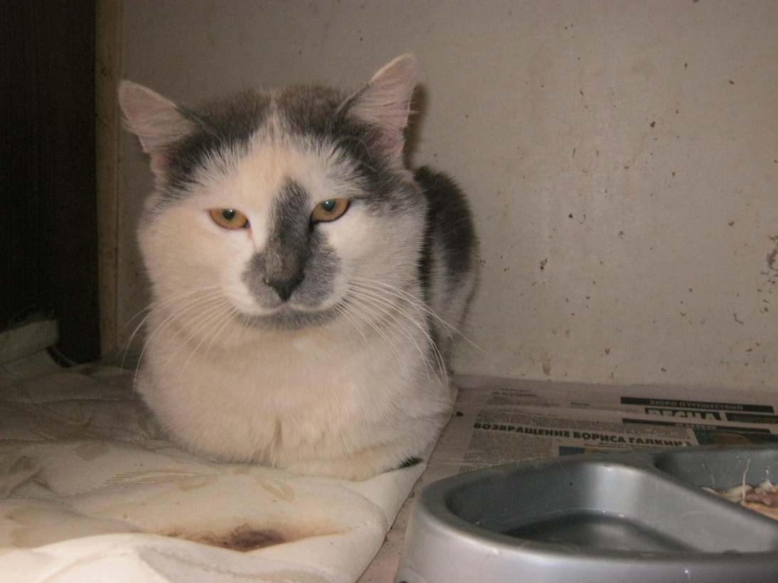 Елена а ты не знаешь где киска, которая после аварии7 зашуганная такая была. окрас - белая с серым (зеленым) лежала вся в зеленке в средней правой клетке в терапии?