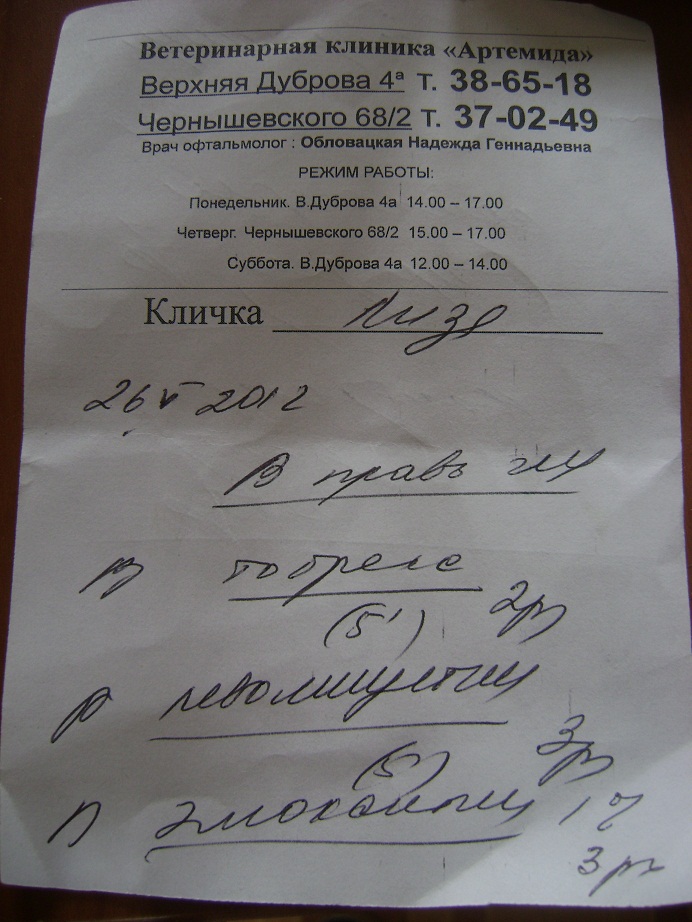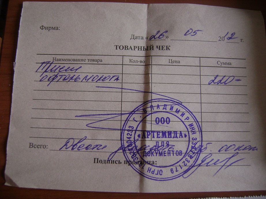 Чек и назначения после посещения офтальмолога. С офтальмологом сама буду завтра разговаривать, нам на контроль завтра.Передержка у нее не спрашивала.