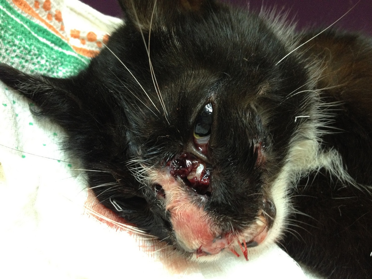 Всем привет! В общем излагаю ситуацию... Котейку оказывается зовут Васька. Малыш у меня дома. От наркоза за 7 часов практически полностью отошёл, сразу начал проситься по малой нужде на улицу, дома ну никак не хочет. Сносила его, так он как свои дела сделал, прямиком на прогулку отправился окрестности знакомые изучать) естественно, был сразу же перенесён домой. Оперцию делали час, все прочистили, носик поставили на место, немного теперь губы прикрывают зубки. Провела эксперимент-поставила неподалёку тарелку с едой, он сразу пошёл по запаху к ней, значит, как я понимаю, хоть немного, но обоняние у нас осталось или же восстановилось, хотя не думаю, что так быстро. Отек ещё очень сильный. Как сказал Мумжа(врач), он из щеки кота вынул большой коготь кошачий, поэтому остановились на версии, что всё-таки, подрали так сильно малыша коты.. Назначили нам в уколах Цефтриаксон , Капельно внутривенно Метрогил и гепарин. Пораженные участки обрабатывать промакивая хлоргексидином. Но я думаю, что Гамавит ещё нам совсем не помешает. Кот сильно истощен. Весит не более 1кг. Буду потихоньку откармливать и лечить. На контроль к врачу нам 7-8 июня, швы с губ и челюстей снимать 18-20 июня, хотя это такой длительный срок... Гнить же начнут. В общем состояние пока у нас удовлетворительное. Малявочка под моим чутким контролем.