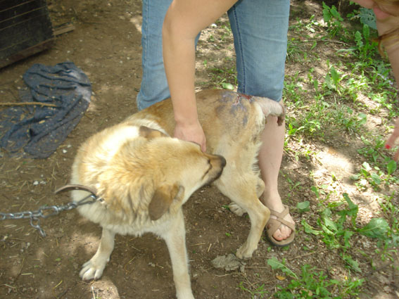 Я вчера гуляла с Найдой, она задние лапы видимо через боль переставляет. И на попе под кожей какая-то трясучка - видимо там жидкость скапливается? Ее еще привязывают в тенечке- комары донимают бедную...