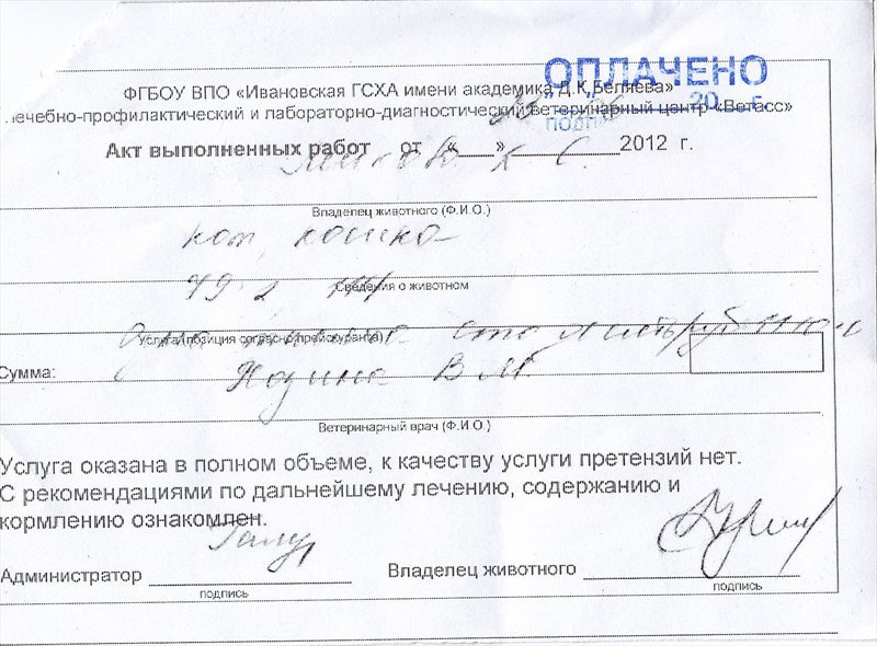 Чеки за приём и анализы крови - всего 4 133 руб. Корм - 576 руб