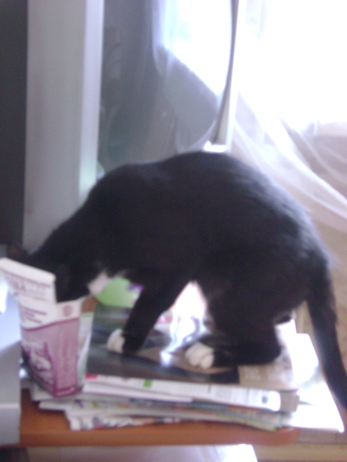 Прикол. Лизка залезла в коробку с витаминами, а вылезть не может.