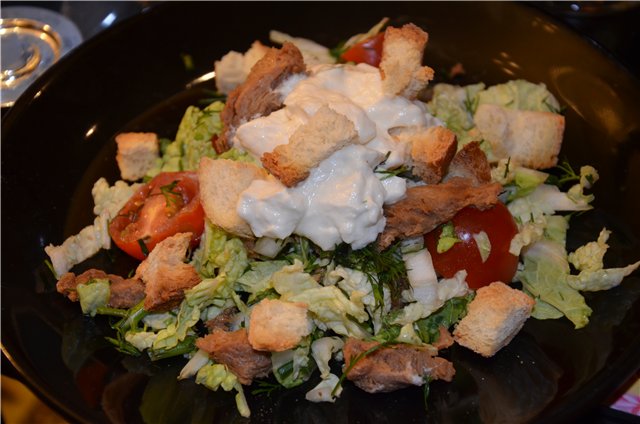 Соевой мясо приготовить как указано на упаковке. Нареззать кусочками и обжарить в раст.масле. Масло должно покрывать полностью все соевое мясо. Откинуть на дуршлак, чтоб лишнее масло стекло. Капусту порезать, добавить мясо, черри. Майонез соевый смешать в бленедре с чесноком и заправить салат. Добавить гренки.