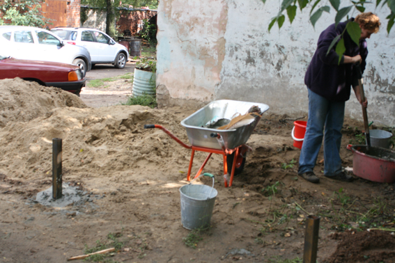 Была сейчас в Валенте, чтобы мелочь собачью сфотографировать, застала Алену, мешающую раствор. Забетонированы столбы.