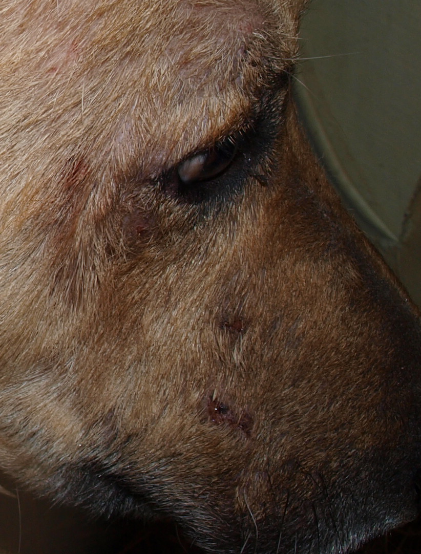 Анна, посмотрите, пожалуйста, фото! Если нужно что-то переснять, то я постараюсь, но Ник жутко не любит фотоаппарат((( И все-таки постараемся привезти его к Вам на осмотр, уже решаем вопрос с доставкой. Расчесы сейчас самые большие и кровавые на морде, но тело тоже постоянно чешет, меняя левую лапу на правую...Обработка Фронтлайном, видимо, не принесла результатов, зато от блох избавились)))