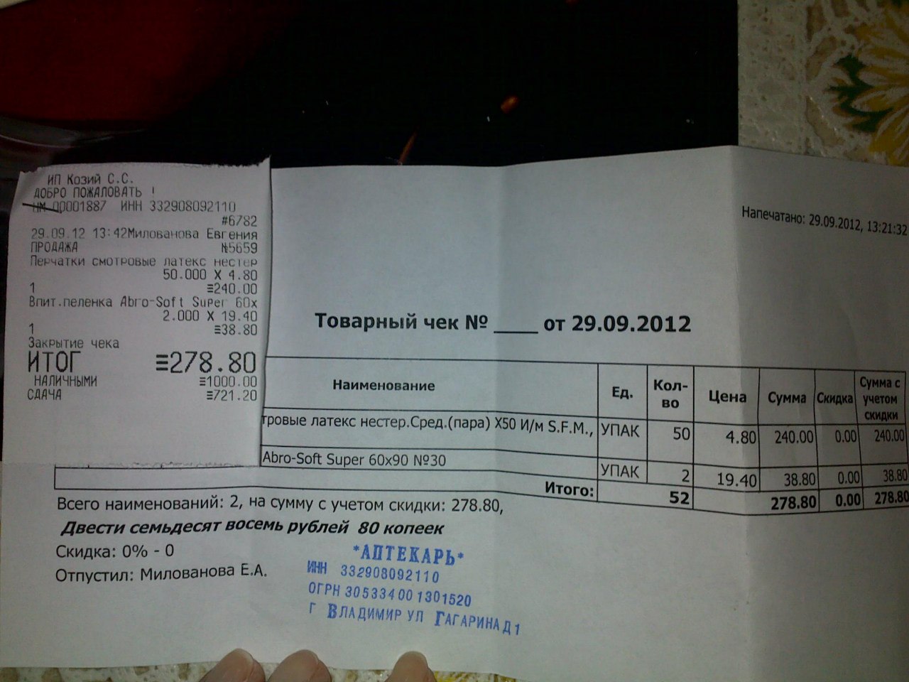 29.09.12 - 278,80 руб. - перчатки (50 пар), пеленки одноразовые (2 шт)